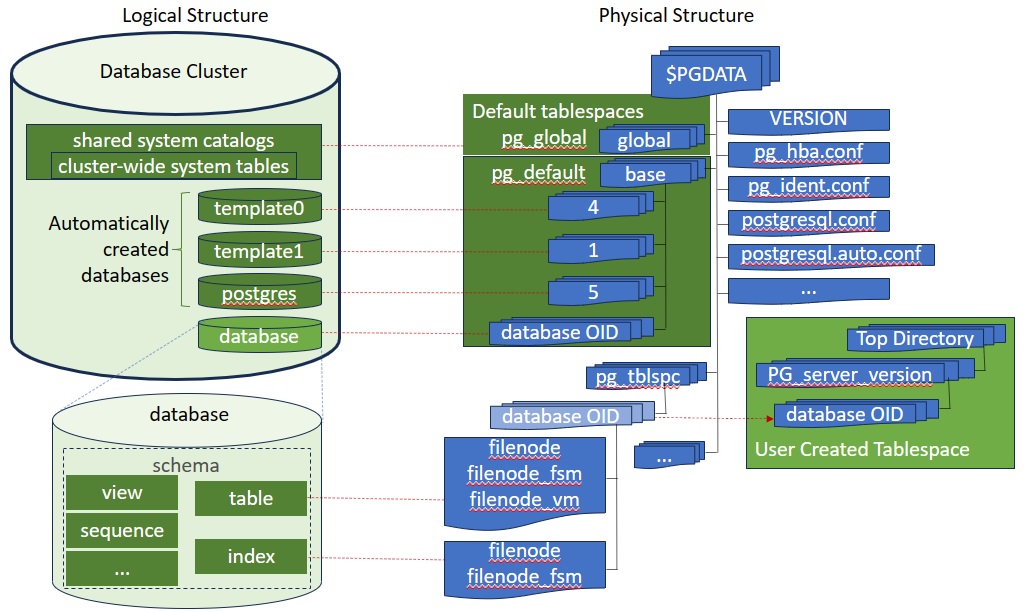 To understand the files in the directory, let's get familiar with some PostgreSQL terminologies and its object hierarchies: